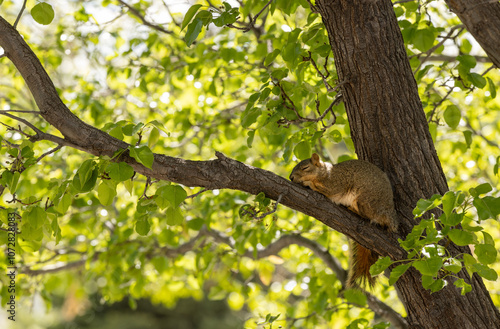 A sleeping squirrel naps on a tree branch in the middle of the day