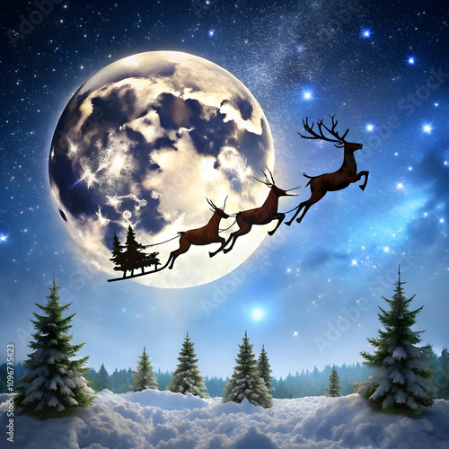 a sleigh with reindeer in the sky and the moon in