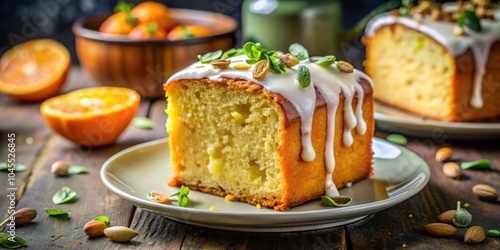 A slice of citrus loaf cake topped with a creamy white glaze, garnished with fresh herbs and nuts, sitting on a grey plate on a wooden table alongside oranges and scattered nuts.