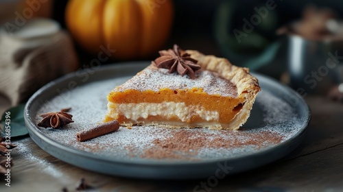 A slice of homemade pumpkin pie with a golden crust and cinnamon dusting