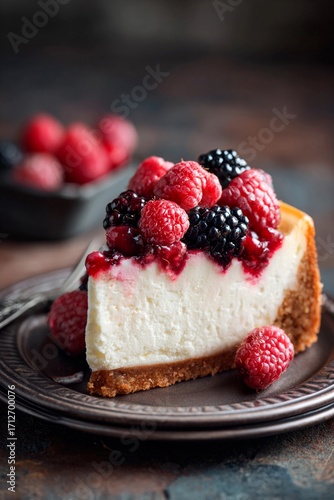A slice of rich cheesecake sits on a decorative plate, adorned with a vibrant mix of raspberries and blackberries. The setting is warm and inviting