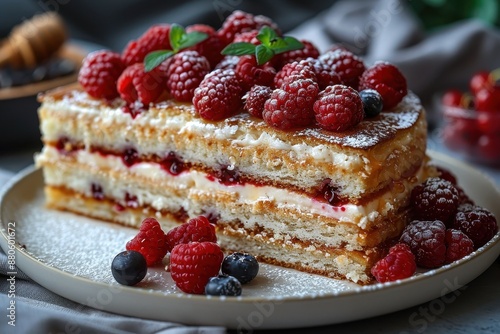 A slice of Russian honey cake, Medovik, with its multiple layers of honey-infused dough and cream filling, garnished with fresh berries.