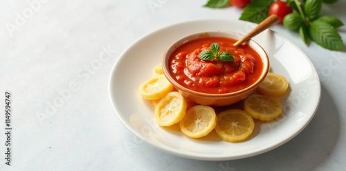A small bowl of bright tomato sauce rests on a white plate, bowl, food