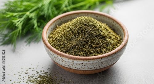 A small ceramic bowl filled with dried dill, with fresh green dill sprigs visible in the soft background, ready for cooking