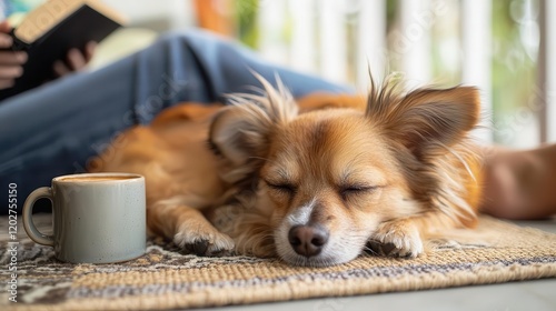 A small dog curled up on a porch rug next to a coffee mug, with the owner sitting nearby reading a book, cozy and inviting