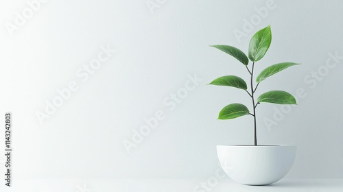 A small green plant in a minimalist white pot on a clean surface against a light background.