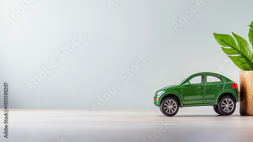 A small green toy car is parked on a wooden surface next to a leafy green plant against a soft blue backdrop promoting eco friendly transportation concepts.