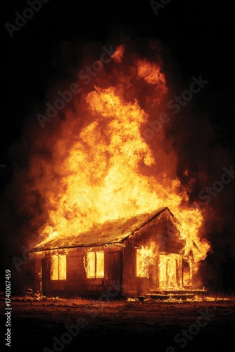 A small house engulfed in intense flames, with smoke billowing against a black backdrop