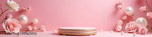 A small, ornate lectern on a pastel pink background filled with pearl ornaments and fine details, sophisticated, round podium