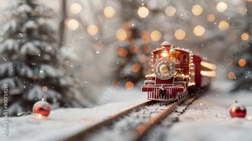 A small red train is traveling down a snowy track. The train is surrounded by Christmas decorations, including a large number of red and gold ornaments. The scene is festive and joyful