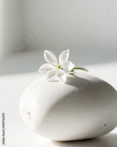A small white flower is on top of a large white stone.