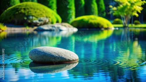 A small Zen stone resting at the bottom of a shallow pool of water with a clear blue sky above and lush greenery surrounding it, highlighting its unique shape , zen garden, water