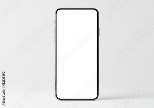 A smartphone with a blank white screen is centered on a white surface in a studio setting image
