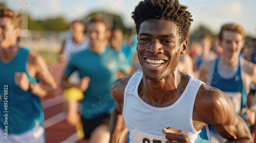 A smiling athlete in a white jersey runs during a marathon on a sunny day, encapsulating the spirit of competition and fitness in a vibrant athletic atmosphere.