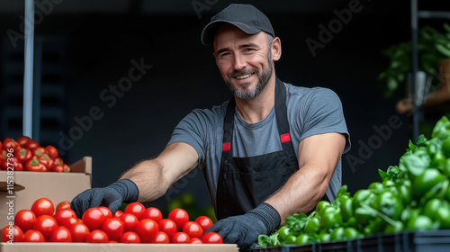 A smiling man stands behind fresh tomatoes and green peppers at a market, showcasing a vibrant display of produce.