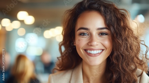 A smiling woman with soft curls wearing professional attire sits in an inviting office space, exuding positivity and confidence, perfect for corporate or personal branding uses.