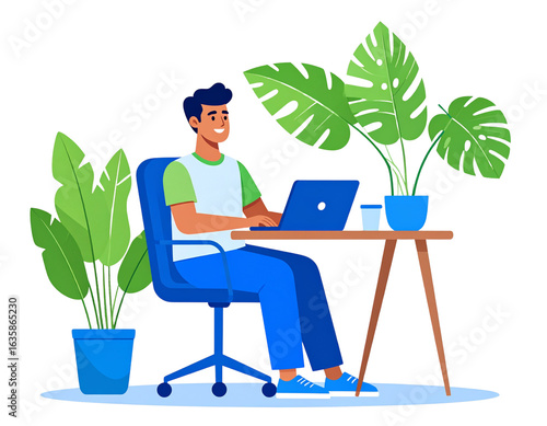 A smiling young man with dark hair working on a laptop seated at a desk in a modern plantfilled workspace.