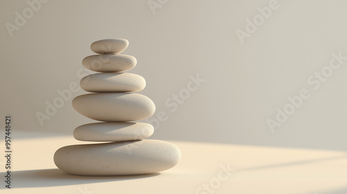 a smooth pebble stack balanced delicately against an isolated warm cream background