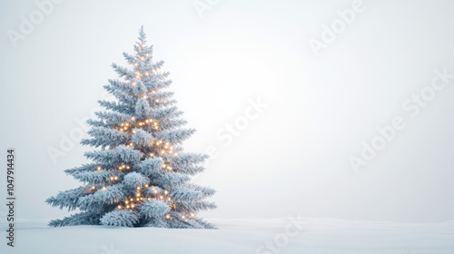 A snowy Christmas tree adorned with lights, standing in a serene, wintry landscape.