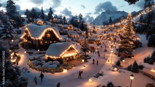 A snowy village at night with glowing Christmas lights, cozy cottages, and people walking with lanterns.