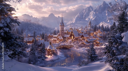 A snowy winter landscape with a cozy cabin in the distance