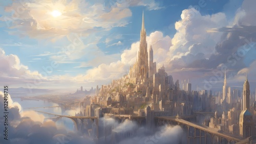 A soaring metropolis in the clouds, its towering spires reaching towards the heavens with a sense of ethereal grandeur. Buildings made of shimmering glass and gleaming steel, reflecting the skye. AI
