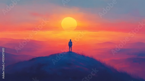 A soft pastel sunrise with the silhouette of a person standing on a hill, representing new beginnings