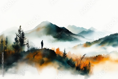 A soft watercolor painting of a mountain climber standing at the peak, overseeing a vast valley covered in mist, with soft blends of green and blue tones