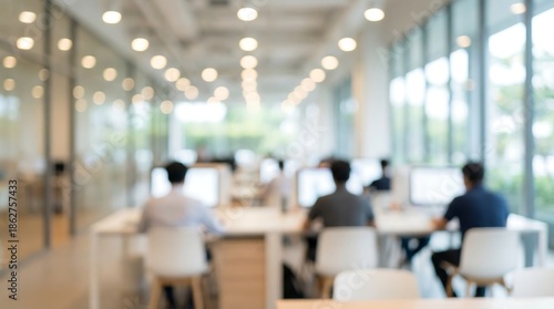 a softly focused view of a modern office space showing several people working at computers in a bright airy environment with blurred details