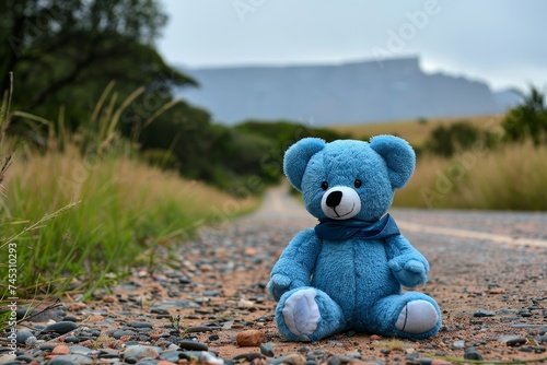 A solitary blue teddy bear sits on a gravel road with Table Mountain looming in the background, evoking loss