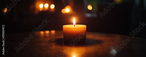 A solitary candle burning softly in a dark room, illuminating a small area around it. The glow of the flame offers warmth and hope, with shadows fading into darkness, comforting space.
