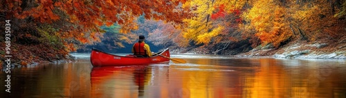 A solitary canoeist paddling under a canopy of autumn leaves on a river, the reflection of colors in the water symbolizing the beauty of a solitary journey