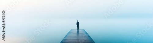 A solitary figure stands on a serene pier surrounded by calm waters, evoking feelings of peace and reflection.