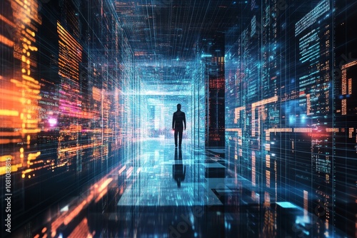 A solitary figure walks through a futuristic data center, a pathway illuminated by digital code, symbolizing the journey of data, technology, and innovation.