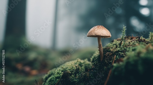 A solitary mushroom emerges from a bed of vibrant green moss, set against a softly blurred backdrop of a misty forest. The scene evokes a sense of quietude and natural beauty