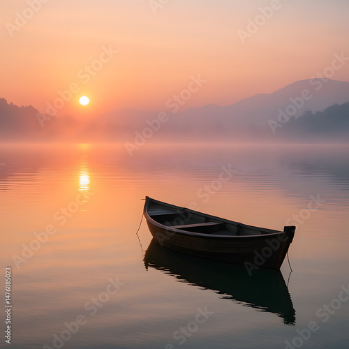 A solitary wooden boat floats on a mirror-like lake during a colorful misty sunrise with hills in the background..