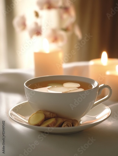 A soothing cup of tea with ginger slices, surrounded by candles and soft lighting.