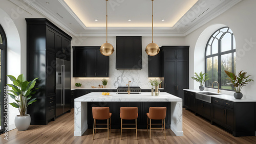 A sophisticated modern kitchen, a haven of sleek black cabinetry and gleaming marble, bathed in warm golden light from elegant pendant lamps, creating a luxurious and inviting atmosphere.