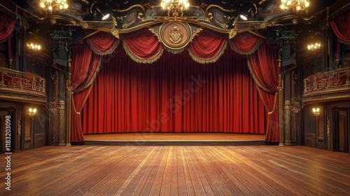 A sophisticated stage setup with modern lighting, detailed curtains, and a perfectly varnished hardwood surface.