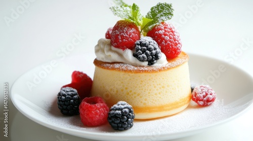 A souffle pancake topped with whipped cream and mixed berries in a white bowl.