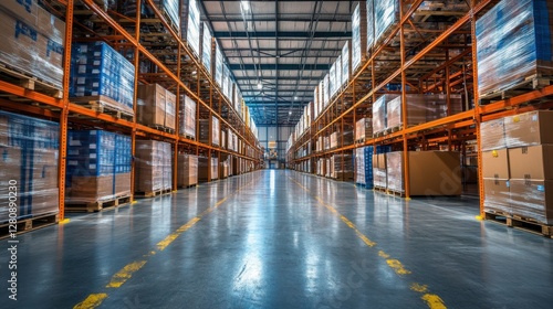 A spacious warehouse with organized shelves filled with stacked boxes, highlighting a clean, industrial environment.