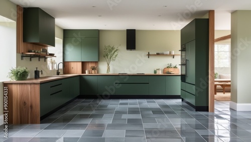 A spacious, well-lit kitchen interior with a botanical green matte finish, paired with wooden elements, features grey floor tiles that reflect the subtle nuances of natural light