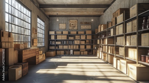 A spacious, well-lit storage room filled with wooden boxes and shelves, showcasing a rustic, industrial design.