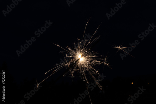 A sparkler illuminates dark evening - bright, golden sparks fly - celebration holiday - new years day, fourth of july, canada day. Taken in Toronto, Canada.