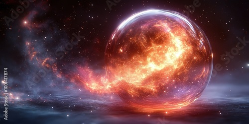 A spherical orb of cosmic energy, radiating vibrant orange and red hues, floats amidst a starry expanse, illuminated by a faint glow emanating from its core.