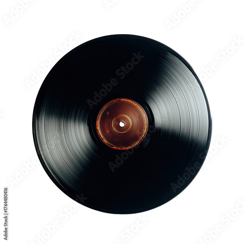 A spinning black vinyl record with a slightly blurred, dark-orange label center