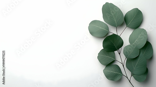 A sprig of pale green leaves with intricate veins on a white surface offering natural freshness