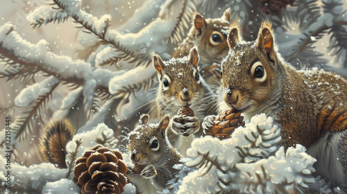 A squirrel family gathering pine cones among frost-covered trees, the intricate details of the snowflakes and the warm hues of their fur painting a picture of life thriving in the cold.