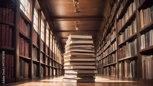 A stack of books in a library or bookstore. Books or textbooks. AI generated image, ai