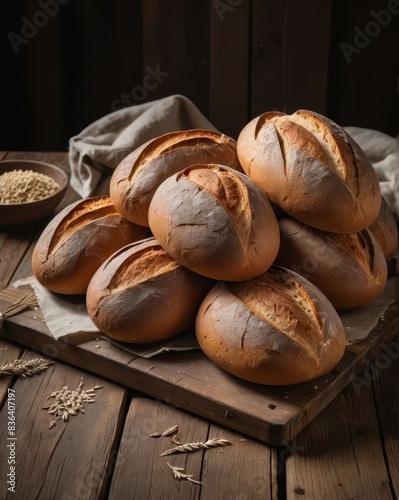 A Stack of Freshly Baked Bread Loaves on a Rustic Wooden Table, Showcasing Golden Crust and Soft Texture, Capturing the Artisanal Baking Craft